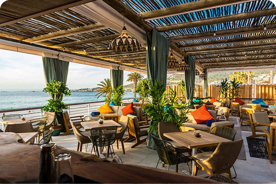 Stylish lighting, soft outdoor textures, warm heaters (for cooler nights), music that lets you talk & laugh (no shouting needed).