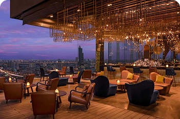 Signature cocktails, curated wine and spirits selection, and small-plates that go perfectly with rooftop air—wagyu sliders, seafood platters, shareable tapas, etc.